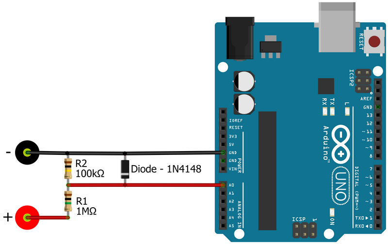 - Le rôle de la diode est de protéger l'Arduino si le branchement du voltmètre est inversé.