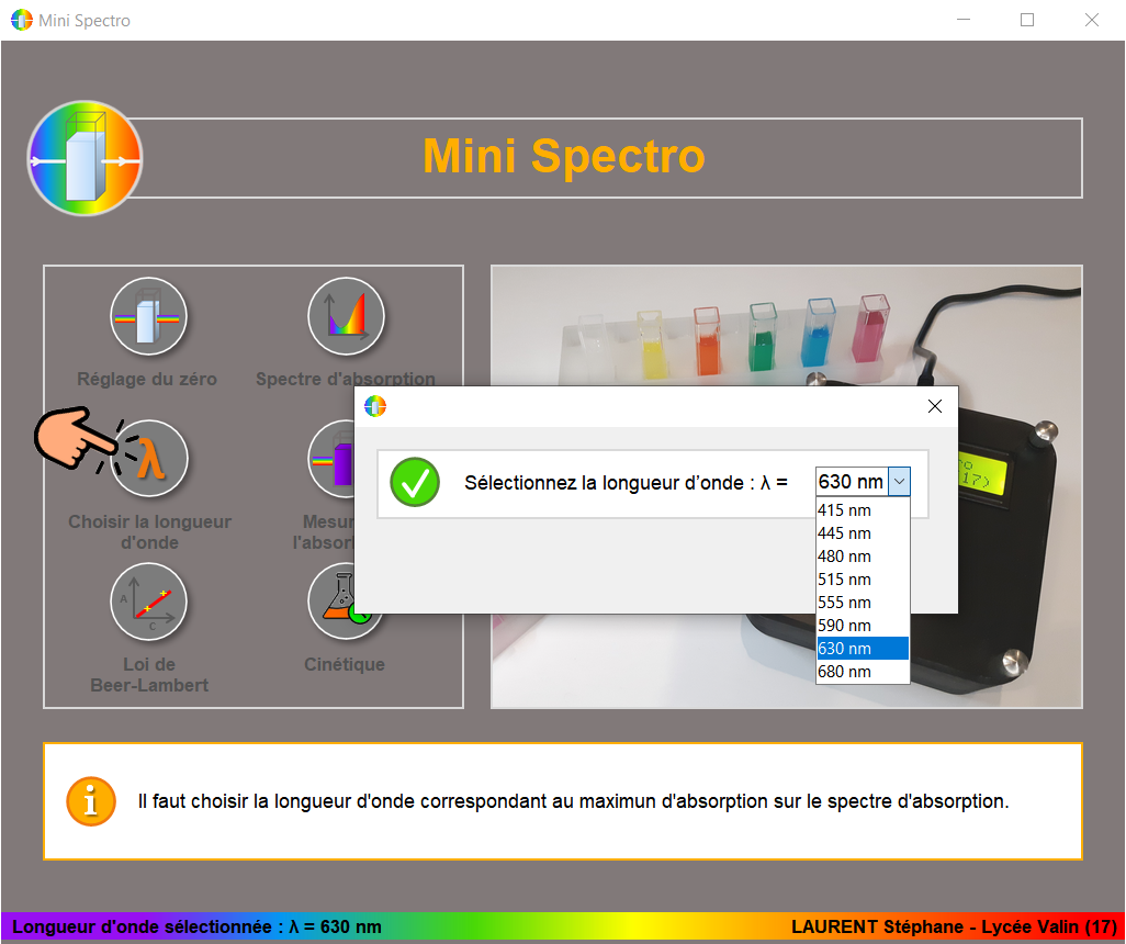 - Pour choisir ou modifier la longueur d'onde pour laquelle vous souhaitez mesurer l'absorbance, cliquez sur “Choisir la longueur d'onde”.