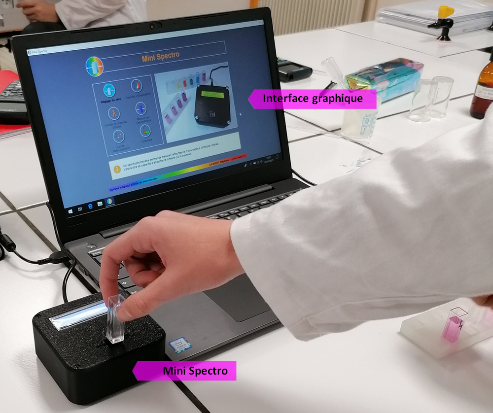 - L'utilisation de ce mini spectro est proche des spectrophotomètres que l’on trouve habituellement dans les lycées. Il permet à nos élèves une première approche, très pédagogique, de la spectrophotométrie.