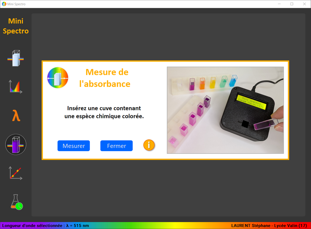 - L'utilisation de ce mini spectro est proche des spectrophotomètres que l’on trouve habituellement dans les lycées. Il permet à nos élèves une première approche, très pédagogique, de la spectrophotométrie.