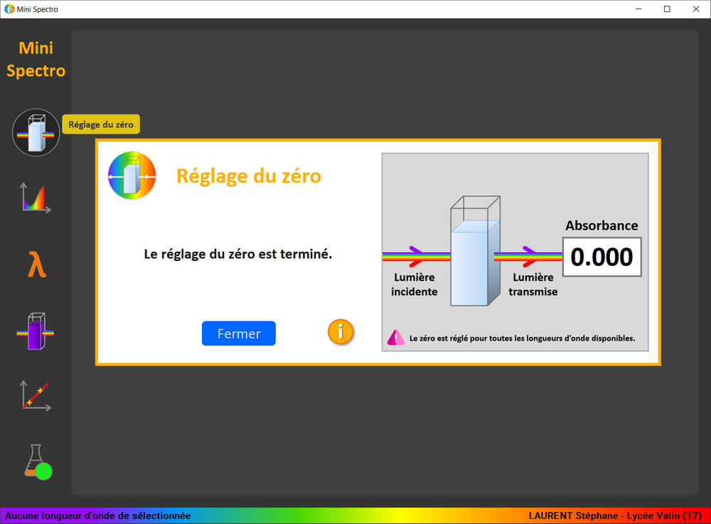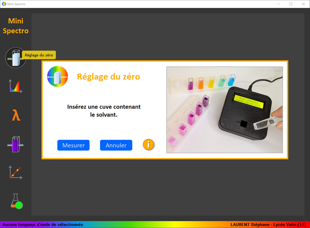 - Sélectionner « Réglage du zéro ». Insérer une cuve contenant le solvant dans le mini spectro puis cliquez sur le bouton “Mesurer”.