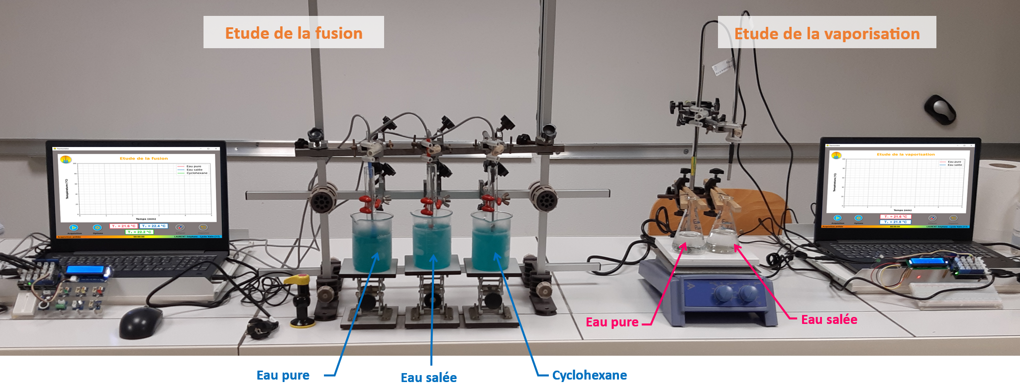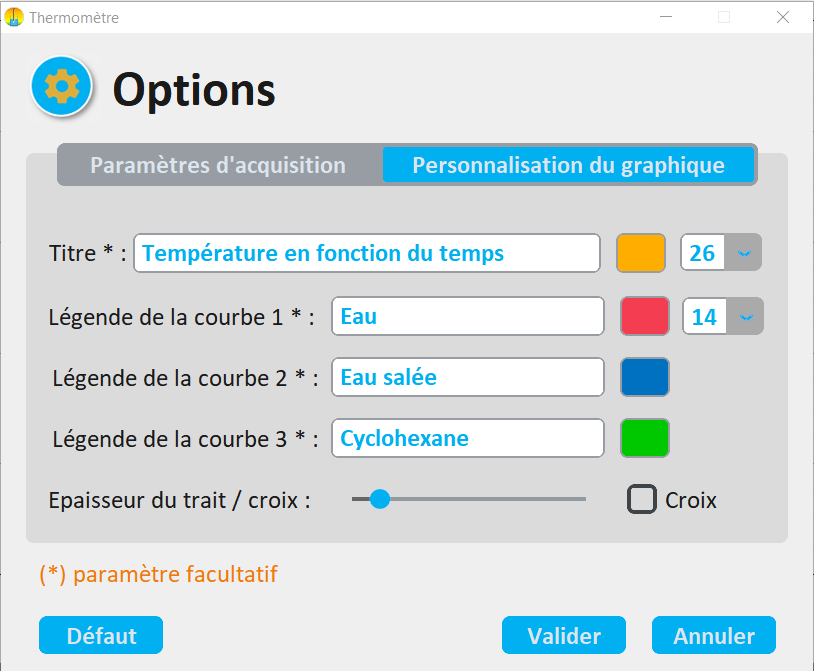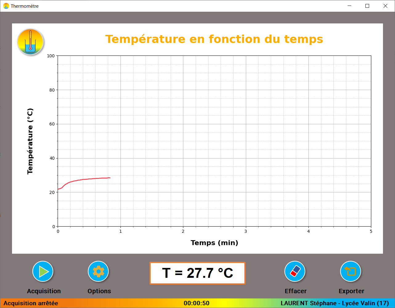 Une interface graphique permet l'acquisition des températures et le tracé en direct de la température en fonction du temps. Elle peut gérer jusqu’à trois thermomètres simultanément. Elle est téléchargeable gratuitement sur cette page.