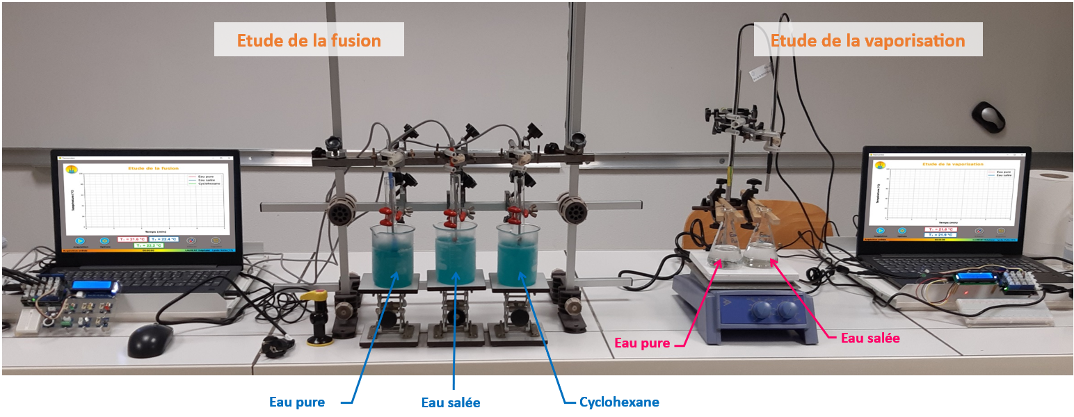 Une interface graphique permet l'acquisition des températures et le tracé en direct de la température en fonction du temps. Elle peut gérer jusqu’à trois thermomètres simultanément. Elle est téléchargeable gratuitement sur cette page.