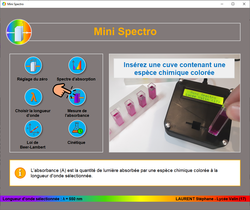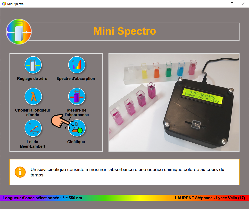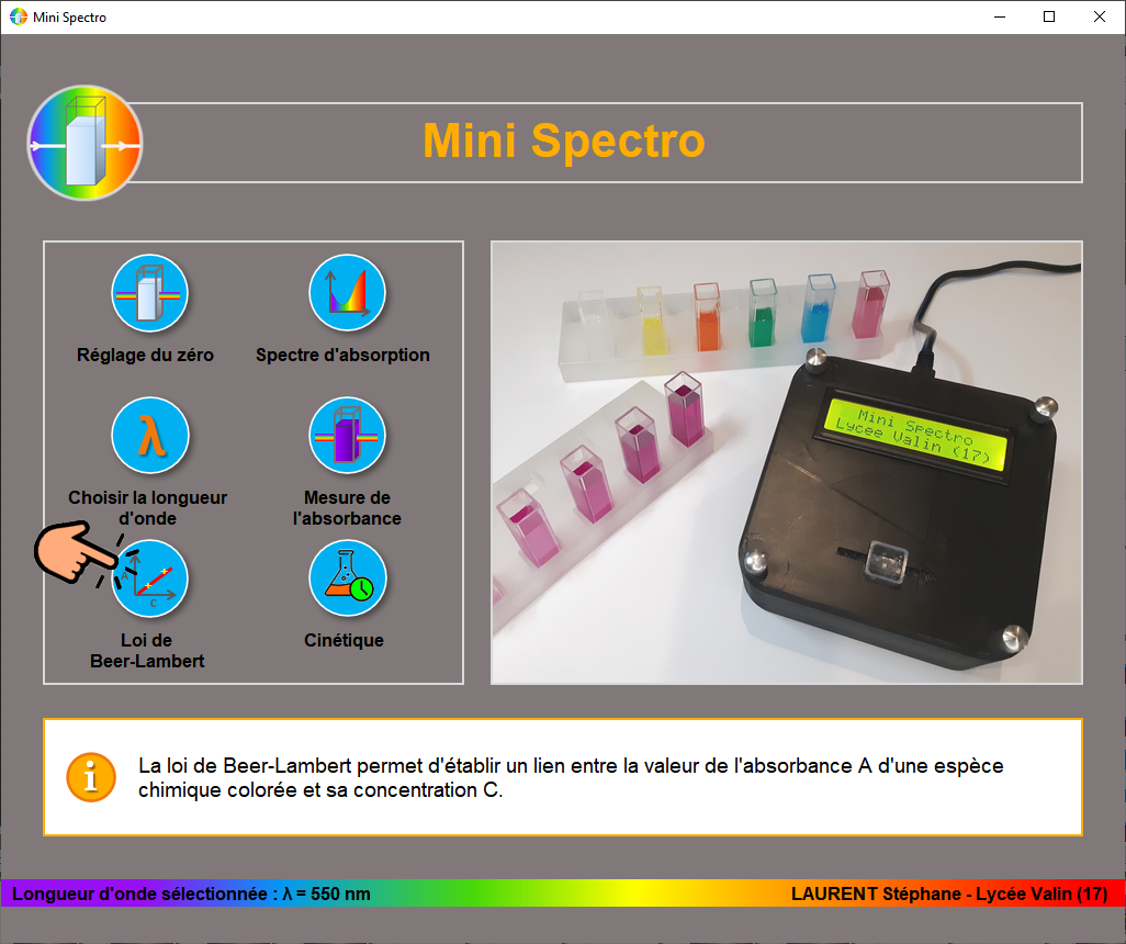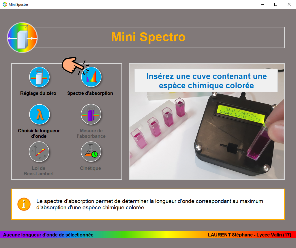 - Une interface graphique permet t'interagir avec ce mini spectro. Elle est très intuitive et permet ainsi une prise en main rapide par nos élèves.