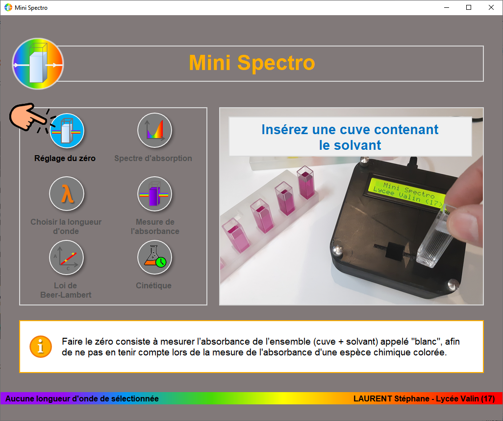 - Insérer une cuve contenant le solvant dans le spectrophotomètre puis sélectionner « Réglage du zéro ».