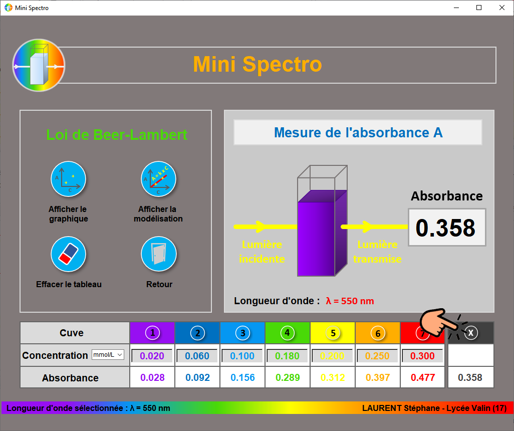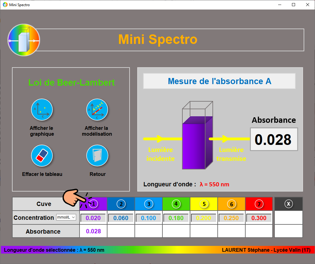 - Modification de la couleur de l'absorbance et de la concentration pour la cuve 5 dans Beer-Lambert.