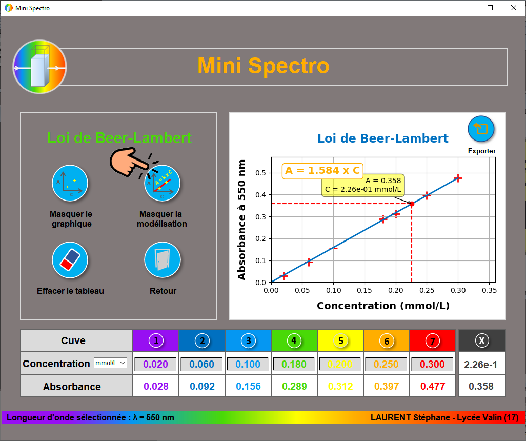 - D’étudier la loi de Beer-Lambert avec un tracé « en direct » de la représentation graphique de l’absorbance en fonction de la concentration et de sa modélisation.