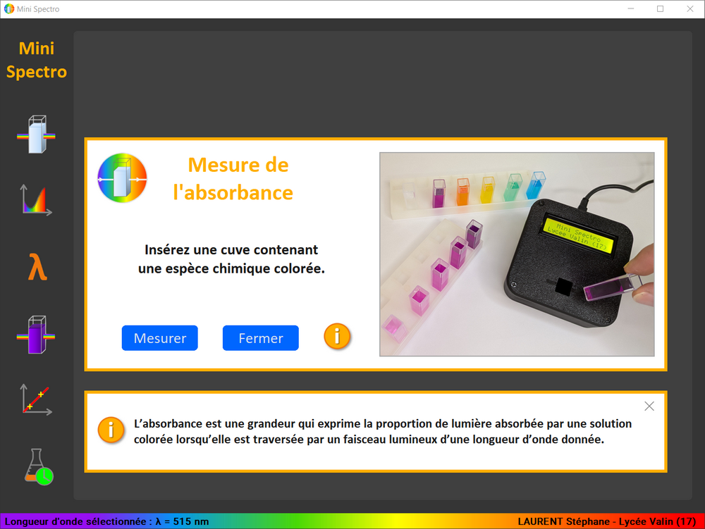 - L'utilisation de ce mini spectro est proche des spectrophotomètres que l’on trouve habituellement dans les lycées. Il permet à nos élèves une première approche, très pédagogique, de la spectrophotométrie.