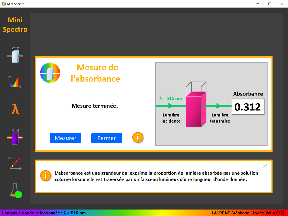 - Insérer une cuve contenant une espèce chimique colorée dans le spectrophotomètre puis sélectionner « Mesurer »