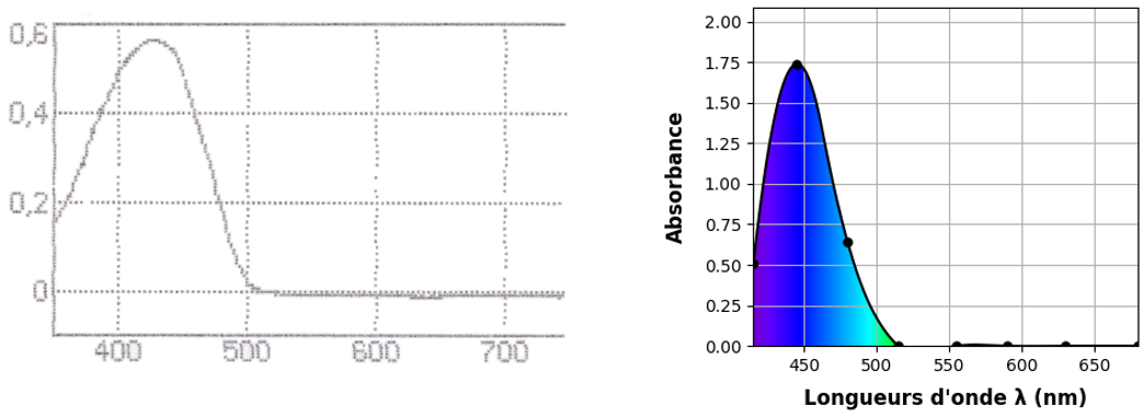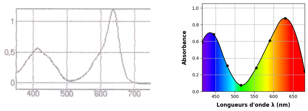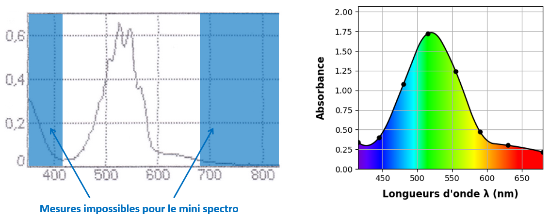 Ce mini spectro ne peut mesurer l’absorbance que pour 8 longueurs d’onde : 415, 445, 480, 515, 555, 590, 630 et 680 nm. Les 8 points sur le spectre correspondent aux mesures réellement effectuées. Le reste du spectre est interpolé.