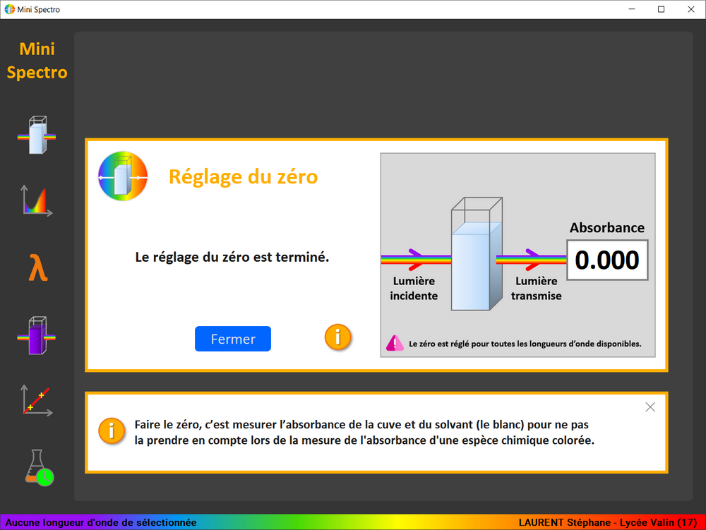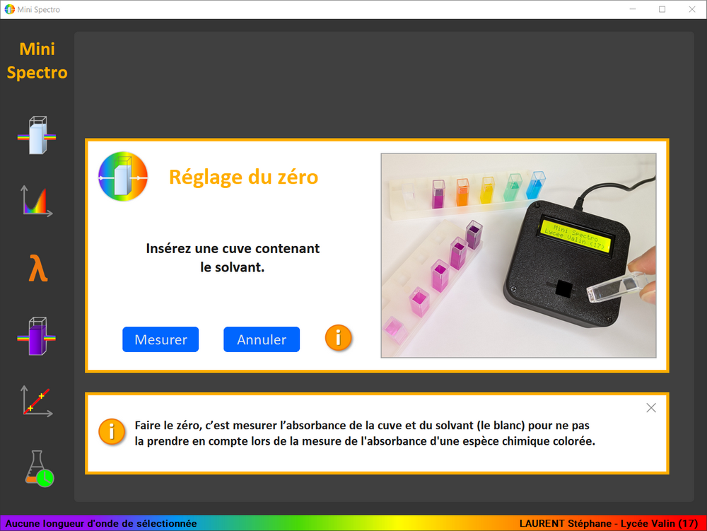 - Sélectionner « Réglage du zéro ». Insérer une cuve contenant le solvant dans le mini spectro puis cliquez sur le bouton “Mesurer”.