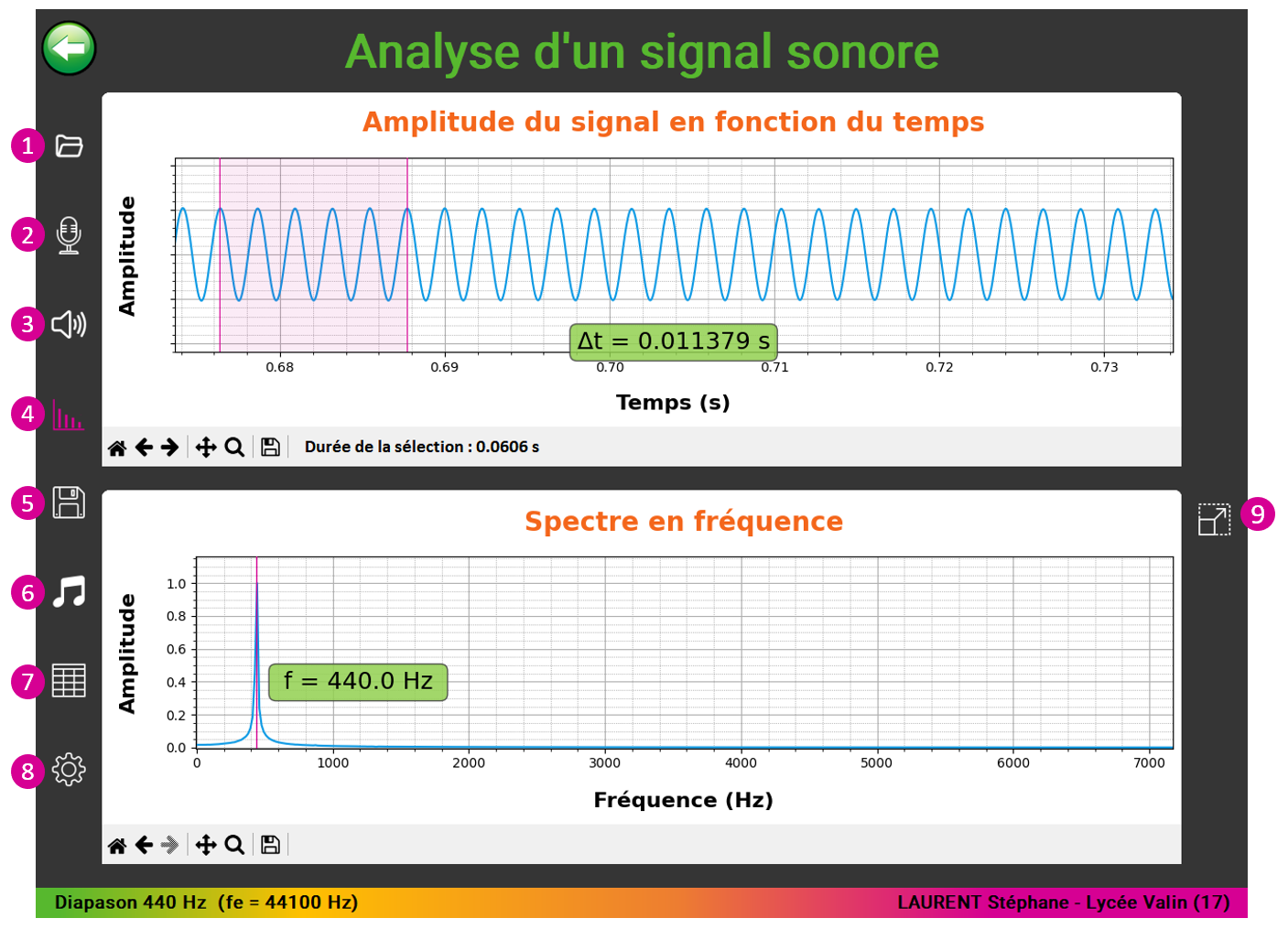 Dans “Analyse d'un signal sonore”, la fréquence d'échantillonnage est par défaut de 176 400 Hz. C'est une fréquence élevée qui permet d'obtenir un signal de qualité. Il convient parfaitement pour l'acquisition de petits échantillons sonores (quelques secondes).