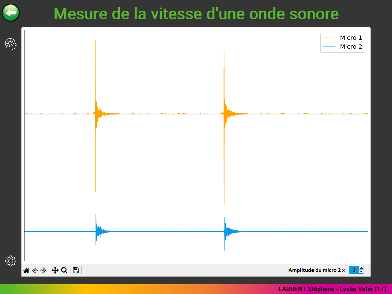 - Le signal du micro 2 peut être fortement atténué rendant la mesure délicate. Il est possible d'amplifier ce signal à l'aide des flèches en bas à droite de l'écran ;
